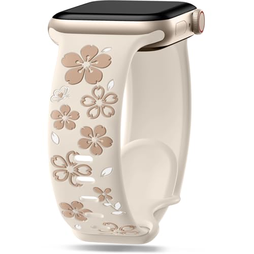 Wepro Cute Floral Engraved Silicone Band: for Apple Watch Bands for Women 40mm 41mm 38mm 42mm 44mm 45mm 46mm 49mm Flower Inlay Dressy Strap - for iWatch SE Series 10 9 8 7 6 5 4 3 2 Ultra Starlight