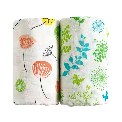Margaux & May Organic Muslin Swaddle Blankets 2 Pack - 100% Organic, Large 47x47 Inches, Breathable Baby Blankets, Pink Dandelion and Green Meadow - Newborn Essentials Must Haves