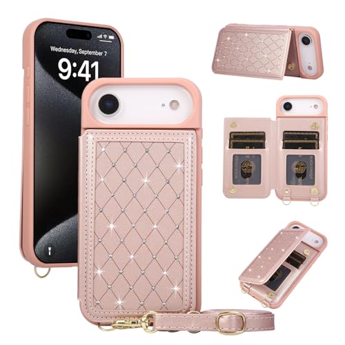 Jcxtrombulous for iPhone 17 Air Wallet Case with Card Holder Slots and Strap, RFID Blocking Magnetic Flip Folio Cover, Crossbody Purse Protection Case with Kickstand,Rose Gold Diamond