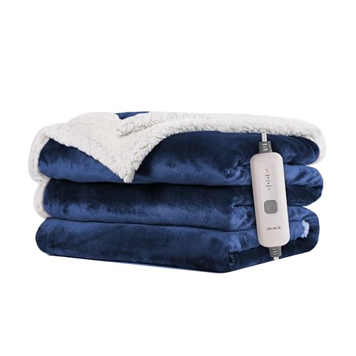 BRILLIO Electric Heated Blanket Flannel & Sherpa 72"x84" Full Size - 4 Heat Levels, 10H Auto Shut Off, Fast Heating, Cozy and Comfortable, Warm Gifts, Machine Washable - Dark Blue