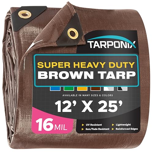 Tarponix Super Heavy-Duty Brown Tarp 12' x 25' – 16 Mil Thick, All-Weather Waterproof Cover with Reinforced Edges and Sturdy Grommets