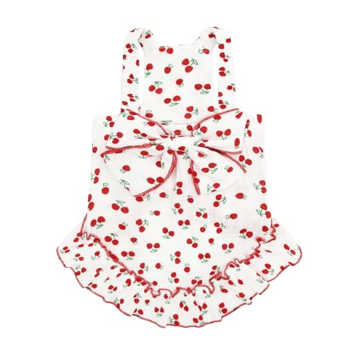 CuteBone Cute Sleeveless Slip Dog Dress with Bow – Soft Cotton Gauze Pet Puppy Sundress with Ruffled Skirt for Small Medium Dogs, Cherry Print Outfit Clothes for Daily Walk, Birthday, Party CDD01S
