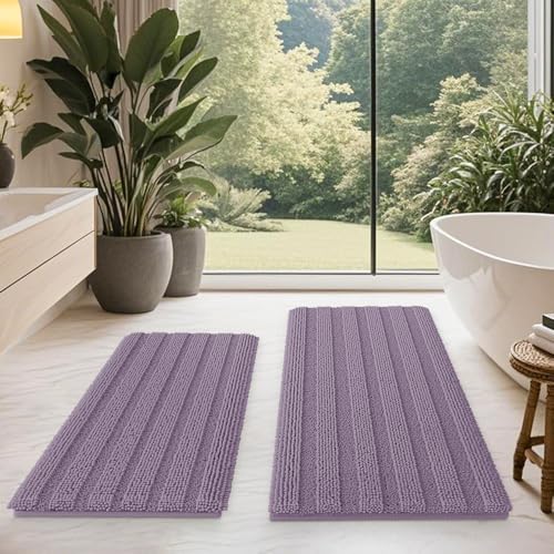 ACCUMTEK Striped Lavender Bathroom Rug Mat Set 2 Piece 32"x20"+24"x17" Ultra Soft, Non Slip Chenille Bath Rugs, Absorbent Plush Shaggy Bath Mats for Bathroom, Bedroom, Kitchen, Shower, Tub