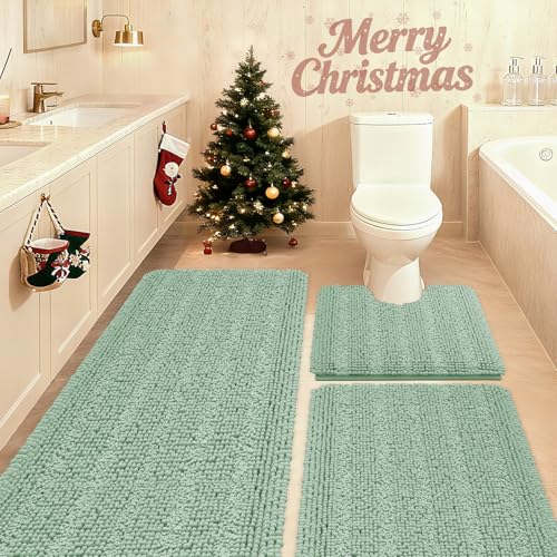 ACCUMTEK Christmas Striped Sage Green Bathroom Rug Set 3 Pieces Ultra Soft, Non Slip Chenille Toilet Mat, Absorbent Plush Shaggy Bath Mats for Bathroom, Bedroom, Kitchen