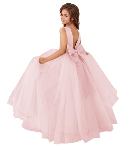 MCieloLuna Flower Girls O-Neck Wedding Bridesmaid Party First Communion Dress Pearls Princess Ball Gowns with Bow-Knot Pink Size 4