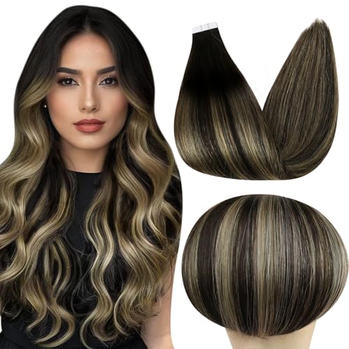 Full Shine Hair Tape in Extensions 18Inch Remy Tape in Hair Extensions Color 1B Off Black Fading to 27 Honey Blonde And Off Black 50G Invisible Tape Hair Extensions Real Human Hair for Wedding 20Pcs
