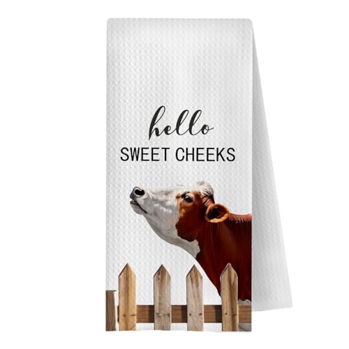 GCFET Funny Cow Bathroom Towels - Hello Sweet Cheeks Cow Decorative Waffle Hand Towels, Funny Farmhouse Bathroom Hand Towels, 16 X 24