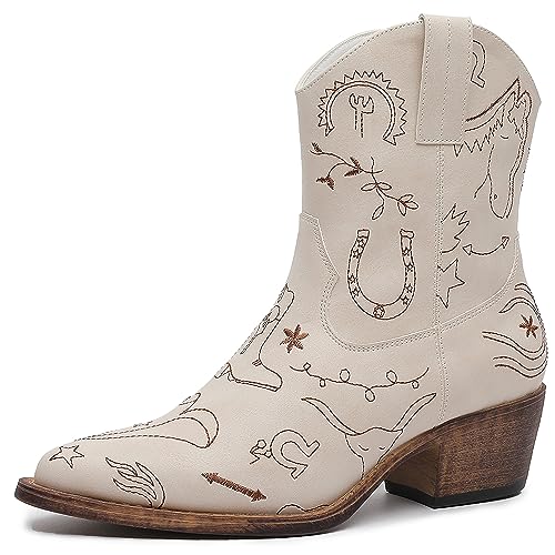 GLOBALWIN Tan Cowboy Boots For Women Cowgirl Boots With Floral Embroidery Western Pointed Toe Boots Ankle Mid Calf Side Zipper Chunky Low Heel Beige Size 8.5M
