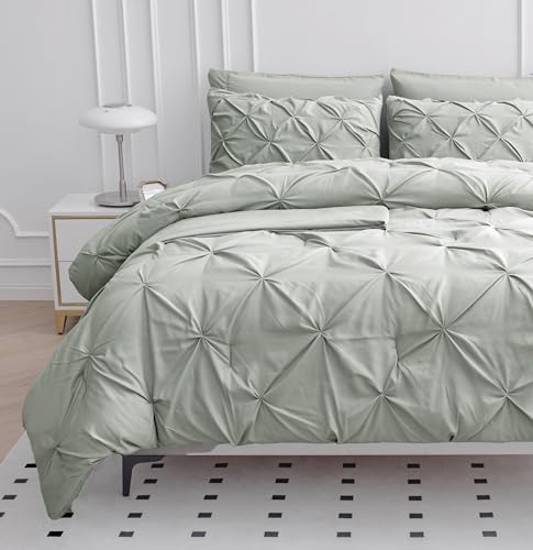 LANE LINEN California King Comforter Set, 7 Piece Cal King Bed in a Bag, Pintuck Cal King Bedding Set, Soft Cali King Bed Set, Cal King Bed Comforter Sets with Sheets, Pillowcases & Shams - Mineral