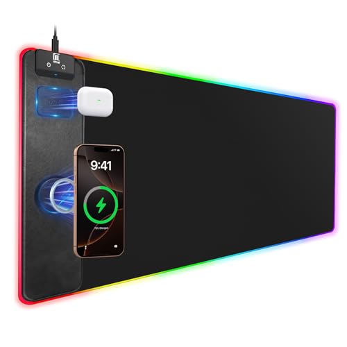 Mouse Pad with Magnetic Wireless Charging, Large Desk Pad Protector, RGB Black Mousepad Desk Mat with 15W Fast Charger, 4mm Thick Non-Slip, Waterproof Laptop Writing Pad for Office, Home, Gaming
