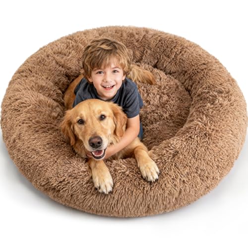 Extra Large Orthopedic Dog Bed Waterproof Removable Cover for Calming Donut Dog Bed Washable,Cooling Gel Foam Round Anxiety Plush Sherpa Covers Comfort for Old Fluffy Friends 48 Inch,Camel