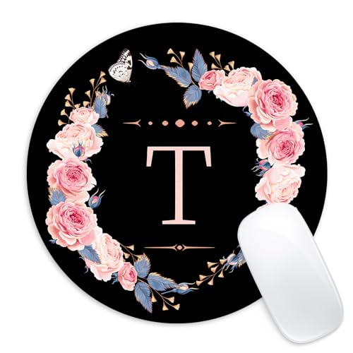 Letter T Black and Pink Flowers Round Mouse Pad,Funny Small Mouse Pad with Non-Slip Rubber Base,Mouse Mat,Home Office Decor Desk Accessories,8.7inch Round Mouse Pad