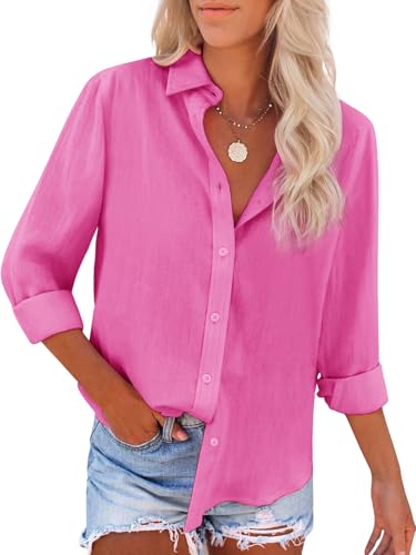 siliteelon Button Down Shirts for Women Dress Shirts Long Sleeve Wrinkle-Free Blouse Casual Solid Office Work Tunic Top - All Hot Pink M