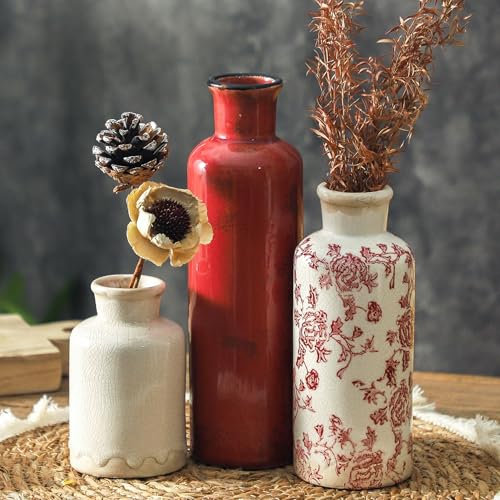 Vintage Vase Set of 3, Ceramic Vintage Flower Vases, Chinoiserie Decorative Home Decor Retro Floral Vase Rustic Farmhouse Decor for Table Bookshelf Mantel Kitchen Living Room Office - Red and White