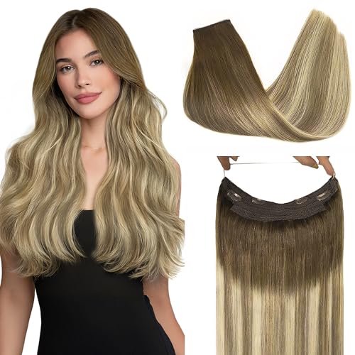 GOO GOO Wire Hair Extensions Human Hair, 3/8/613 Walnut Brown with Ash Brown and Bleach Blonde Balayage 22inch 115g, Invisible Wire Hair Extensions with Transparent, Seamless Fish Line Hairpiece