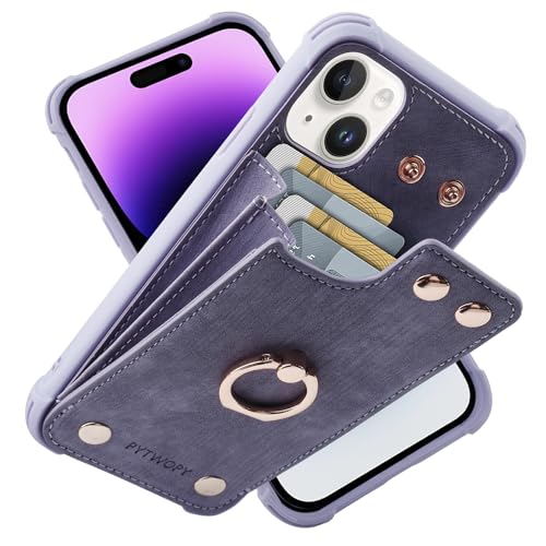 PYTWOPY Wallet Case Compatible for iPhone 15 with Credit Card Holder,Leather Shockproof Protective Phone Cover 6.1 inch Supports 360°Rotation Ring Stand and RFID Blocking,Lavenders
