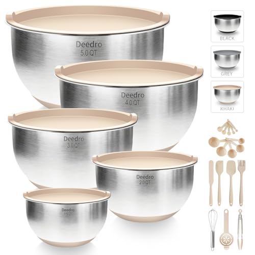 Deedro Premium Mixing Bowls With Airtight Lids Set, 22Pcs Thicker Stainless Steel Mixing Bowl Set, Large Prep Metal Bowls, Non-Slip Silicone Base Nesting Bowls for Kitchen, 1.5/2/3/4/5 QT, Khaki