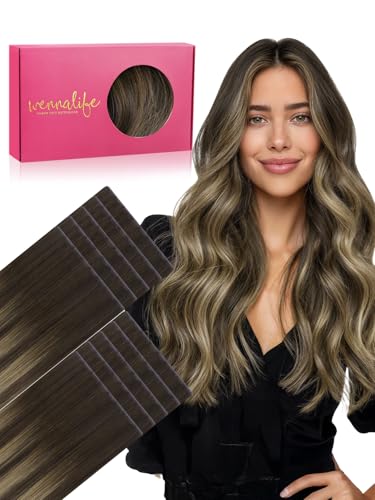 WENNALIFE Invisi Edge 8cm Tape in Hair Extensions Human Hair, 18 Inch 50g 10pcs, Balayage Chocolate Brown to Caramel Blonde Invisible Remy Tape Ins Straight Reusable Extensiones De Cabello Humano