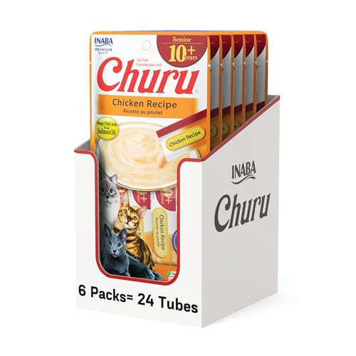 INABA Churu for Senior 10+, Creamy Lickable Cat Treats with Taurine, Vitamin E & C, 0.5 Ounces Each, 24 Tubes (4 per Pack), Chicken Recipe