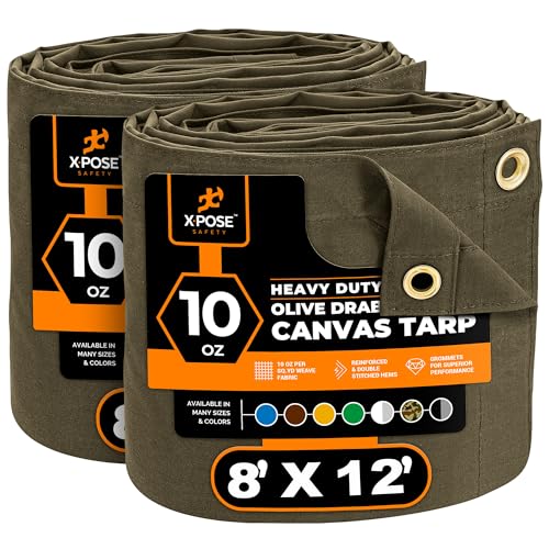 Xpose Safety Canvas Tarp - 10oz Olive Drab Canvas Tarps Heavy Duty Water Resistant with Brass Grommets- Multipurpose Outdoor Tarpaulin for Camping, Canopy, Trailer, Equipment Cover 8' x 12' (2 Pack)