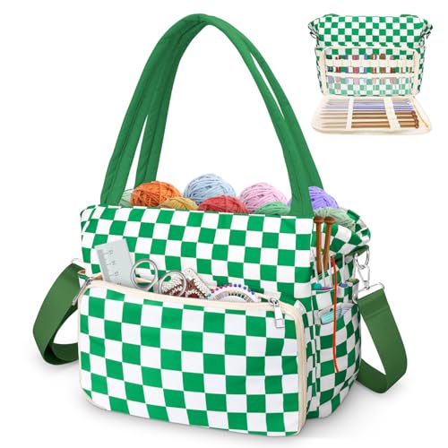 DALINDA Yarn Storage Bag Organizer,Crochet Bag - Portable Yarn Bag & Knitting Craft Tote,Multi-Pocket Design for Crochet Lovers,Ideal Gift for Knitters (Green Plaid)