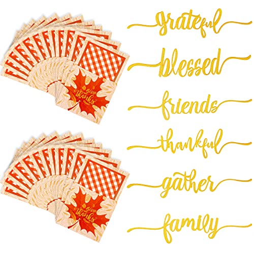 ANOTION Thanksgiving Table Decorations, 24 Thanksgiving Cutlery Holder 24 Thankful Grateful Blessed Words Cutout Card Decor Glitter Table Place Card for Thanksgiving Turkey Utensil Décor