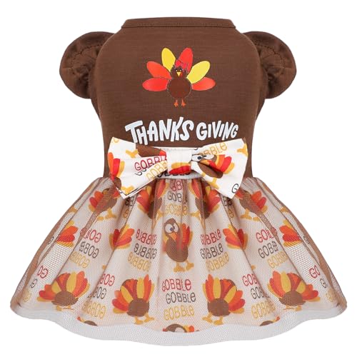 Yikeyo Thanksgiving Dog Clothes, Turkey Print Dress, Costumes with Bow Small Clothes Holiday Girl Doggy Outfits Vest Dresses for Small Dogs Girl Dresses (Khaki, XS)