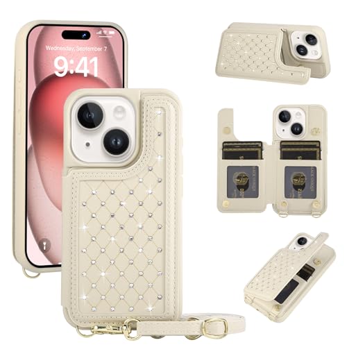 Jcxtrombulous for iPhone 15 Wallet Case with Card Holder Slots and Strap, RFID Blocking Magnetic Flip Folio Cover, Crossbody Purse Protection Case with Kickstand,Beige Diamond