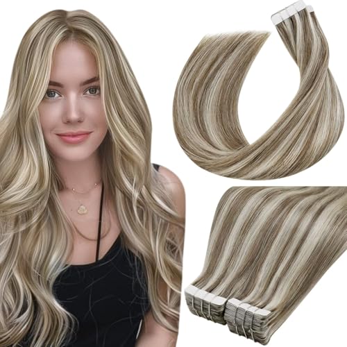 LaaVoo Human Hair Tape in Extensions Real Hair Extensions Tape in 16Inch 40Pcs 100G Invisible Tape in Hair Extensions Human Hair Blonde Highlights with Brown Tape Hair Extensions Full Head