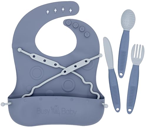 BUSY BABY Bungee Bib & Utensil Set – Adjustable Silicone Bib with Pocket & Tethered Utensils for Babies & Toddlers