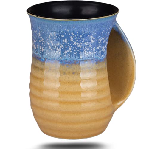 oojdzoo Hand Warmer Coffee Mug - Large Hand Warming Mug 16 Ounce Ceramic Handwarmer Pocket Handmade Pottery Right Handed (Blue,Yellow Sand)