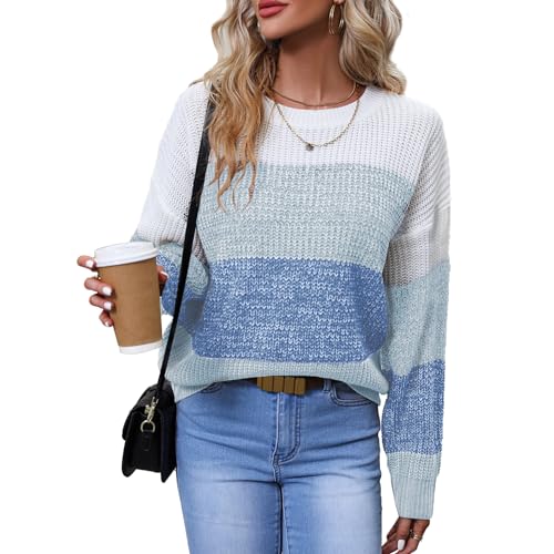 QIANSIQIANBO Women's Striped Color Block Sweater Long Sleeve Crewneck Casual Loose Adult Knit Sweater Pullover Tops (L) Blue