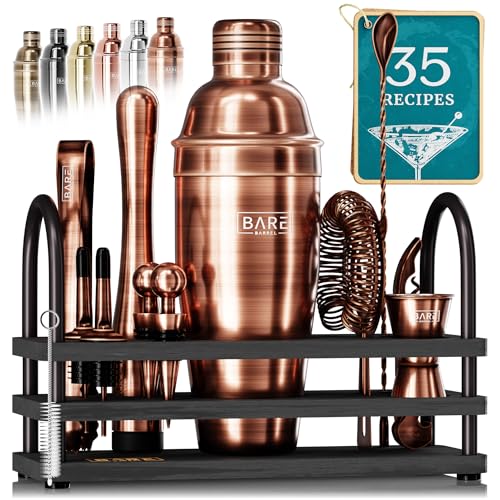 BARE BARREL® Mixology Bartender Kit Bar Set | 14-Piece Cocktail Shaker Set | Martini Barware Mixing Tools for Home Bartending | 35 Recipe Cards | Gift Set (24oz Cobbler Shaker, Copper/Black)