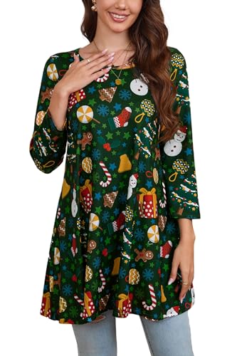 ENMAIN Christmas Womens Tunic Tops 3/4 Sleeve Loose Fit Tunic or Tops to wear with Leggings Plus Size Green Flare Ladies Blouse Holiday Fall Tops