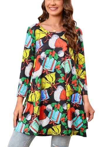 ENMAIN Womens Tunic Tops Plus Size Loose Fit 3/4 Sleeve Christmas Black Flare T Shirt Dressy Casual Ladies Blouse Bell Hat Swing Crewneck Holiday Fall Tunics for Leggings