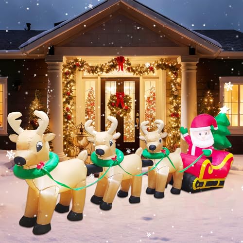 14FT Christmas Inflatables Santa Claus on Sleigh Outdoor Decorations, Santa Claus on Sleigh with 3 Reindeer, LED Lighted Outdoor Yard Decoration for Xmas Party Decor Yard Garden Lawn