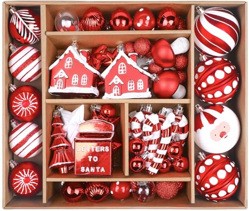 SHareconn 80ct Christmas Balls Ornaments Set, Shatterproof Plastic Colorful Xmas Decorative, Baubles for Tree Decorations with Hanging Strings, Red & White