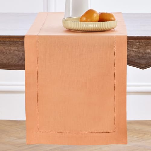 Solino Home Linen Coral Hemstitch Table Runner 36 Inches - 100% Pure Linen Small Table Runner 14 x 36 Inch Ideal for Dresser and Coffee Tables - Classic Hemstitch