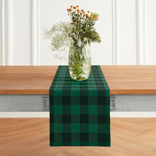 Solino Home Linen Checkered Table Runner 144 Inches Long - 100% Pure Linen Buffalo Check Green and Black Table Runner 14 x 144 Inch Ideal for Dining, Christmas, Winter