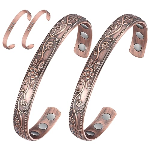 Feraco Copper Bracelet for Women, 11X Ultra Strength Magnetic Bracelets, 99.99% Pure Copper Cuff Bangle with 3500 Gauss Neodymium Magnets, Adjustable, Vintage Flower Collection (Set of 2)