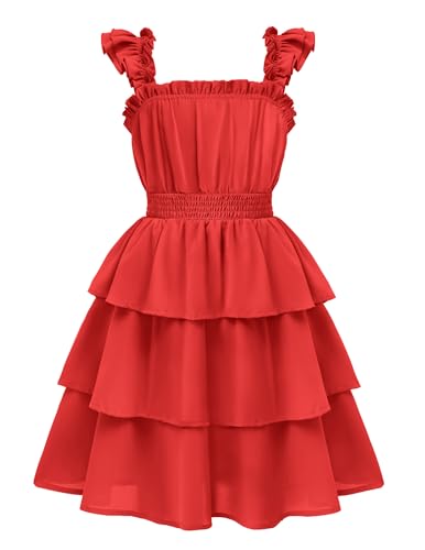 Arshiner Girls Dresses Ruffle Flutter Sleeve Summer Floral Tiered Casual Party Dress for 13-14 Years Red