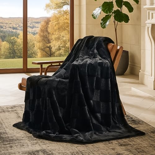 Cozy Bliss Checkered Faux Rabbit Fur Black Throw Blanket, Soft Fuzzy Fluffy Minky Furry Plush Blankets for Couch, Bed (50 * 60 Inches Black)