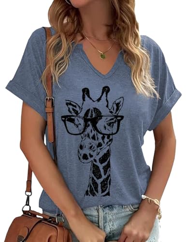 PUCKOLITY Funny Giraffe Graphic V Neck Shirts for Women Casual Short Sleeve Animal Lover Summer Tee Tops(M,3 Ink Blue)