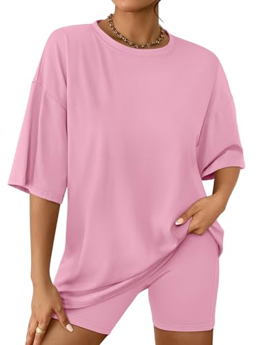 AUTOMET Womens 2 Piece Sets Summer Outfits 2025 Two Piece Lounge Set Matching Clothing Oversized Tshirts Biker Short Fashion Pink S