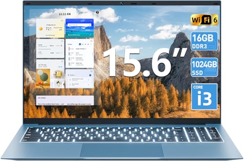 Naclud 15.6 Inch Laptop Computer, Windows 11 Laptops with 16GB RAM 1024GB SSD, Core i3 CPU(Up to 3.9GHz), Backlit Keyboard, 53.2WH Battery, WiFi 6, IPS FHD Display, 180° Viewing, HDMI, Type-C
