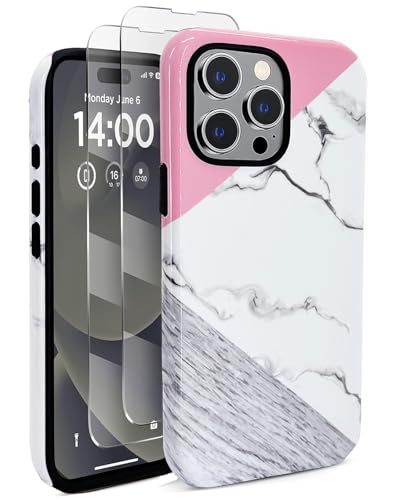 J.west Compatible with iPhone 15 Pro Max Case 6.7" with 2 Pack Tempered Glass Screen Protectors,Marble Design Pink Geometric Anti-Scratch Hybrid Cover for Girls Women Aesthetic Protective Phone Cases