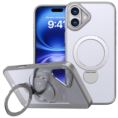 IYH Magnetic Case for iPhone 16 6.1 inches, 360° Rotatable Ring Stand, MagSafe Compatible, Military-Grade Shockproof, Translucent Design Skin-Feel TPU Frame(Gray)