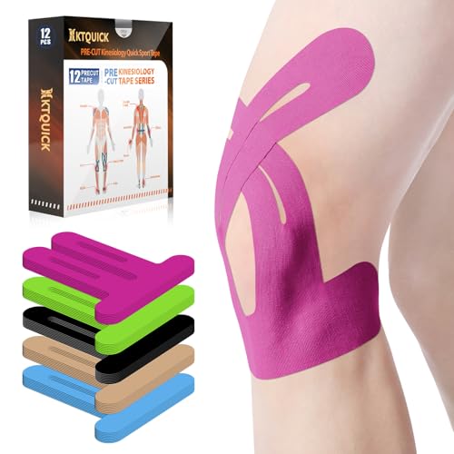 PreCut Kinesiology Tape for Knees, 12 PCS Waterproof KTQUICK Knee Tape for Knee Pain Relief Pre Cut, Original Cotton Athletic Knee Tape, Waterproof & Hypoallergenic Latex-Free for Sports (Pink)