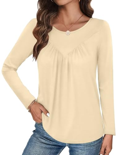 Bliwov Womens Long Sleeve T Shirts Fall Fashion Outfits Casual Blouses Loose Fit Tops Crew Neck Ruched Tunic Trendy Clothes Apricot