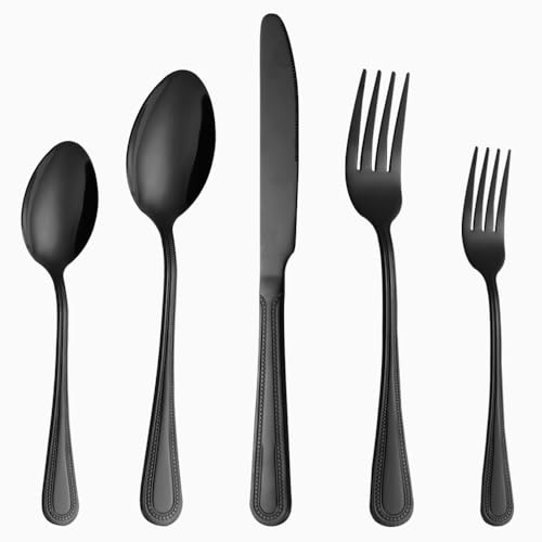 40 Pcs Black Silverware Set for 8 with Pearled Edge Handle design, Food Grade Stainless Steel Flatware Set, Eating Utensils Sets Include Fork/Knife/Spoon, Reusable Cutlery Set, Dishwasher Safe
